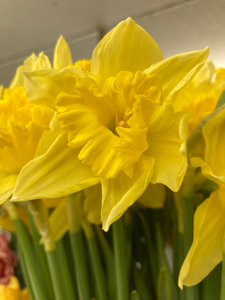Vad sägs om gula tulpaner, påskliljor, ( både som snitt och i kruka), vackra orkidéer, gula begonior, gula kalanchoe, fin fina penséer, påskarrangemang med mera.
